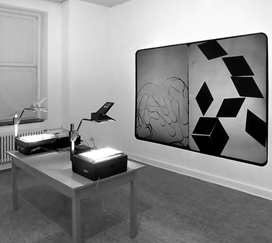 Tonbandecho, dessen Bandschlaufen sich über einen zweiten Overheadprojektor