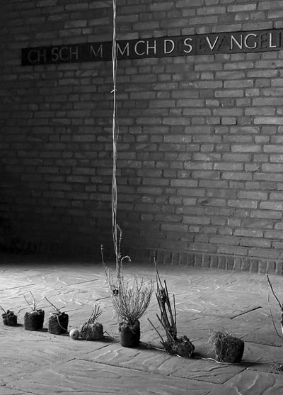 vor eine Wand mit den Plastischen Bildern von Joseph Beuys auf dem Boden "abgelegt"