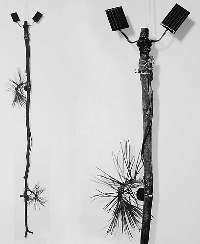 Zweig mit Zwergkieferbüscheln, Elektronik (Solarsoundmodule, Solarzellen,
